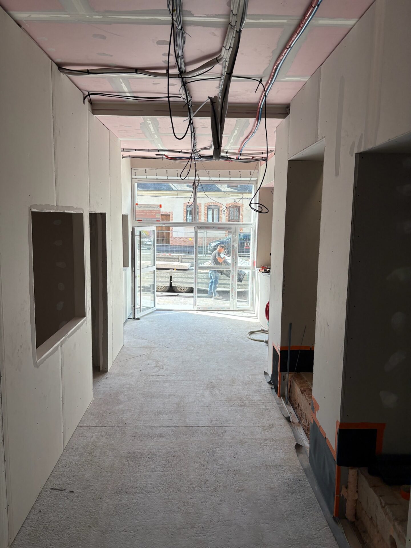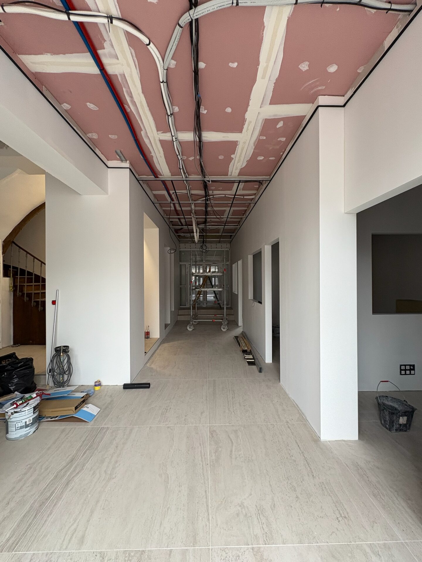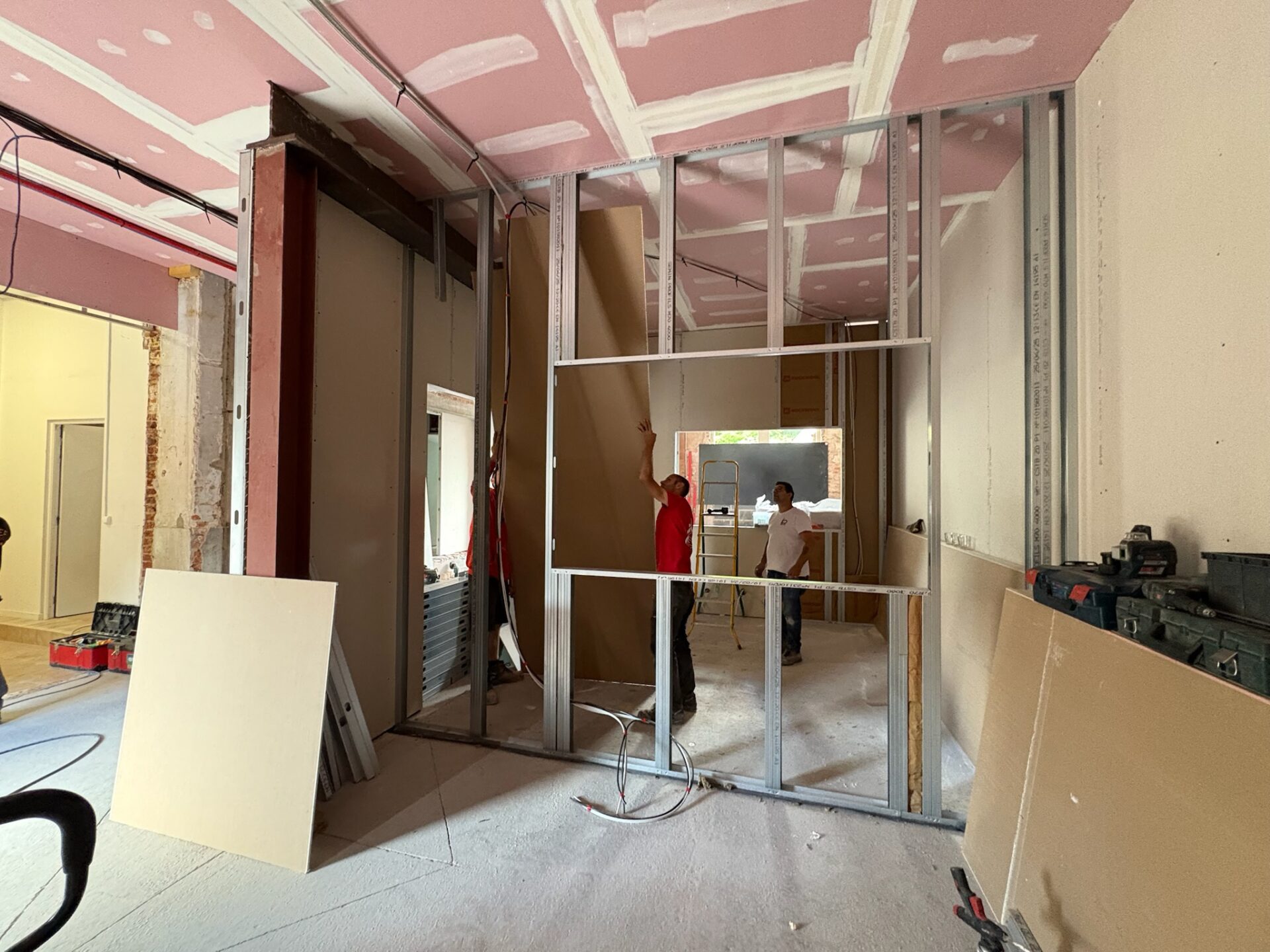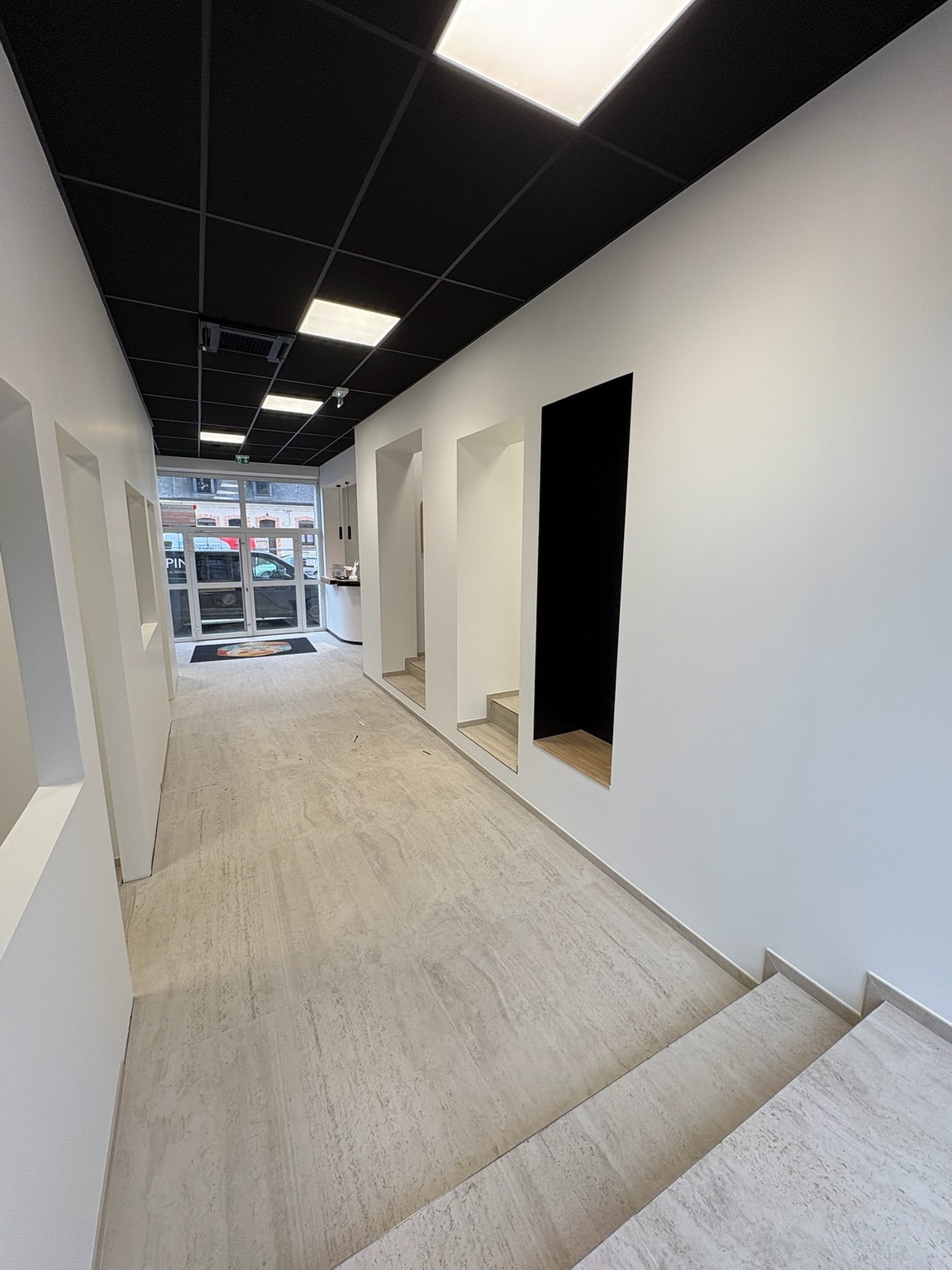 • Travaux de plâtrerie et d’enduit : Pose de cloisons en plaques de plâtre sur ossature métallique, doublages et faux plafonds dalles 120 X 60 coloris noir. Application d’enduits de finition sur l’ensemble des surfaces pour garantir une planéité et une préparation optimale avant mise en peinture.