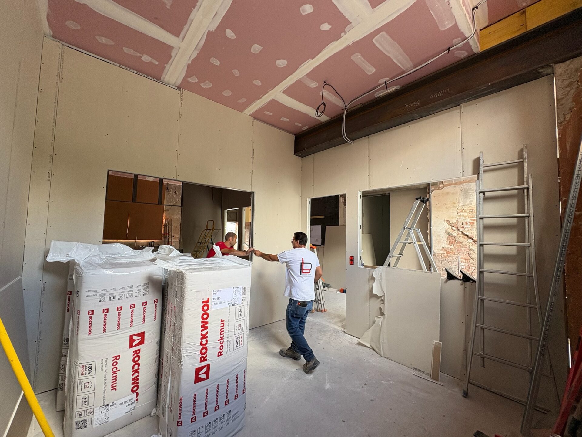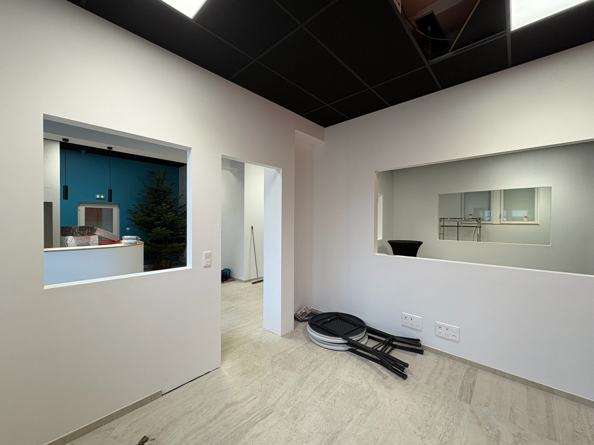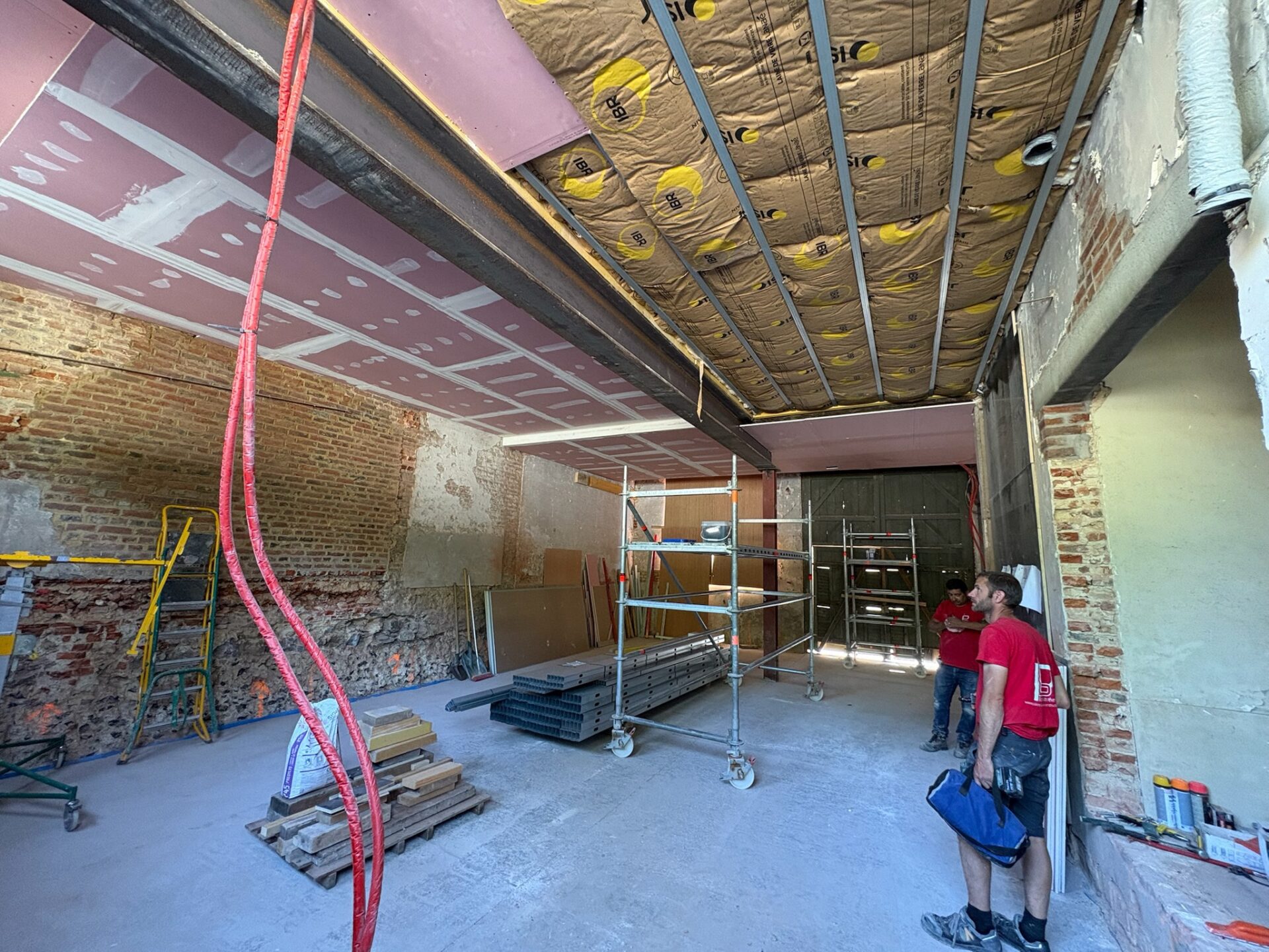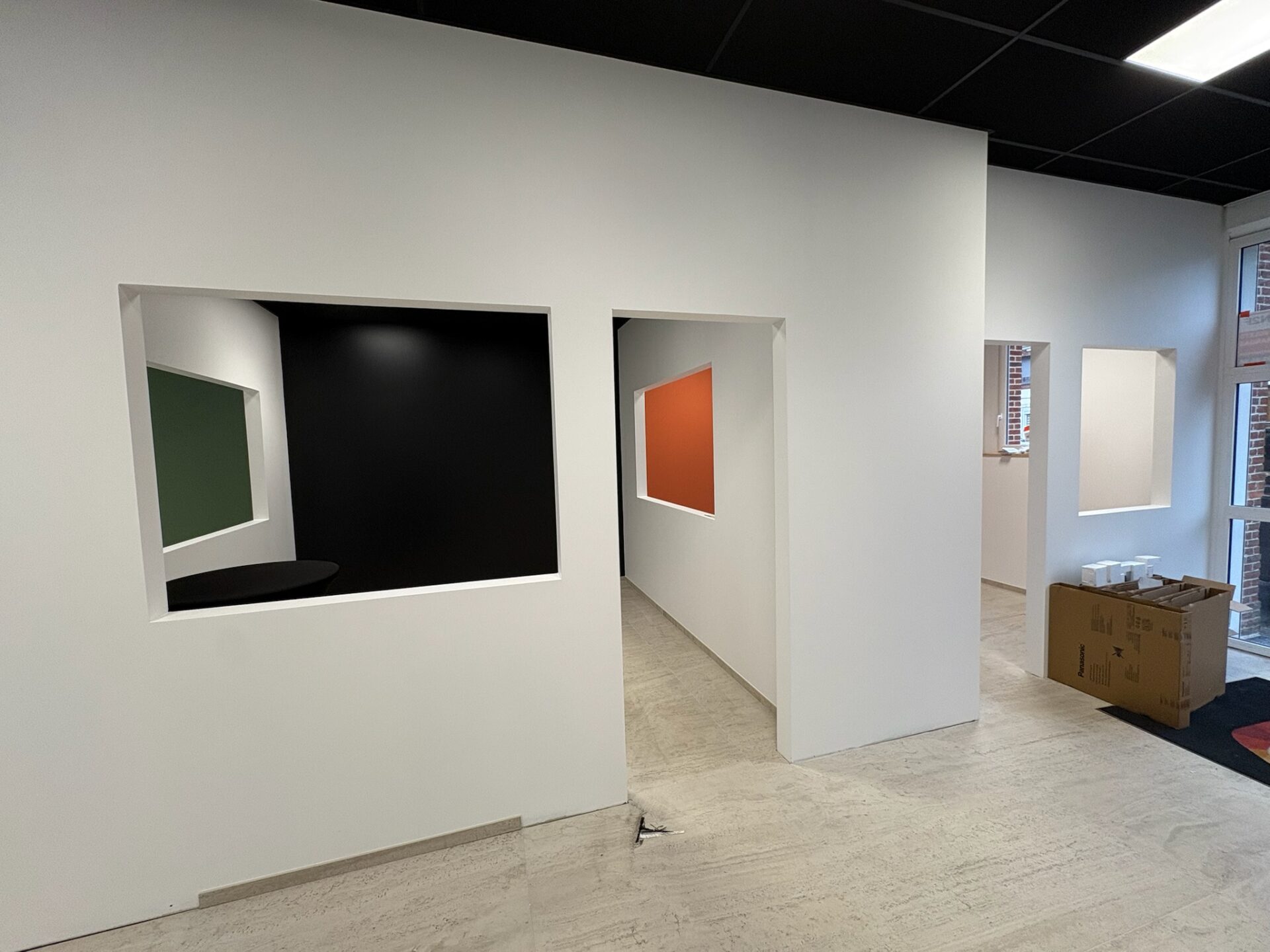 • Travaux de plâtrerie et d’enduit : Pose de cloisons en plaques de plâtre sur ossature métallique, doublages et faux plafonds dalles 120 X 60 coloris noir. Application d’enduits de finition sur l’ensemble des surfaces pour garantir une planéité et une préparation optimale avant mise en peinture.