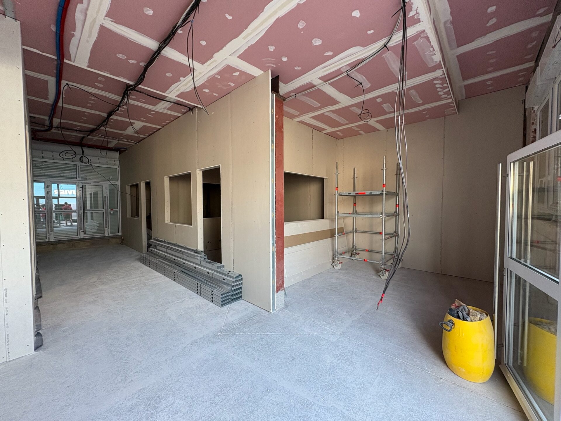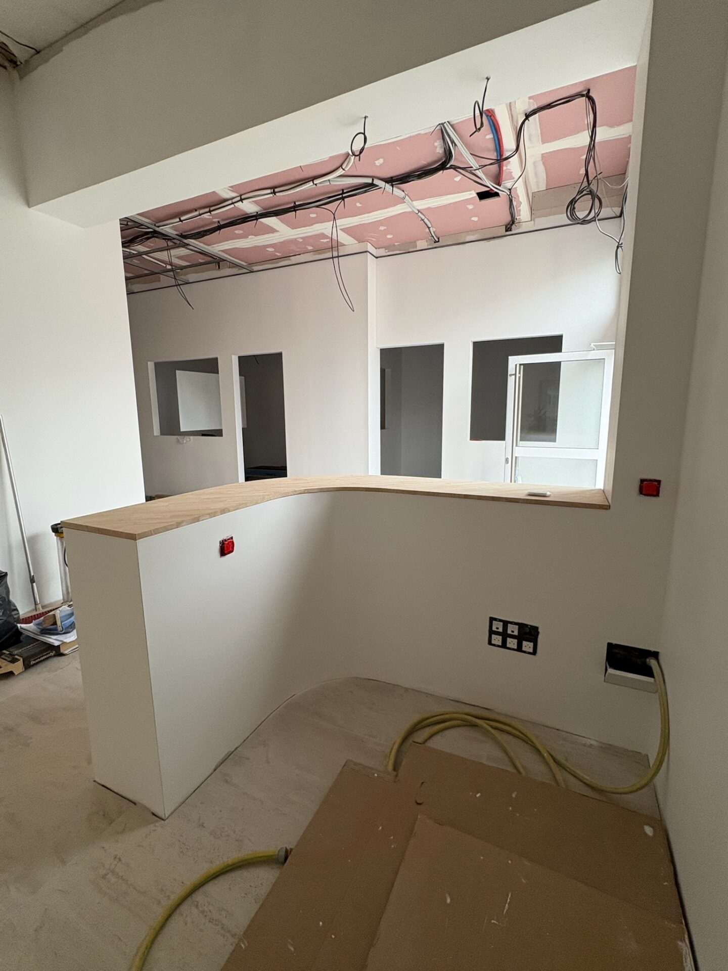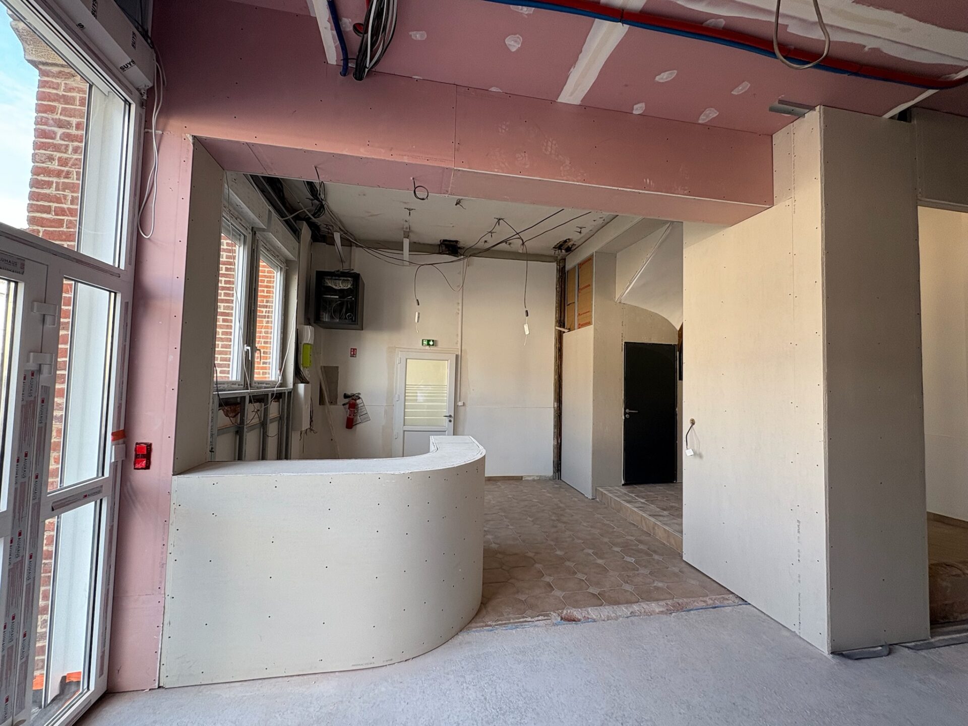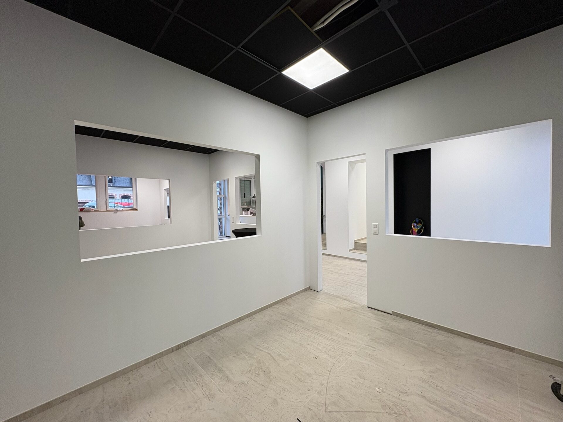 • Travaux de plâtrerie et d’enduit : Pose de cloisons en plaques de plâtre sur ossature métallique, doublages et faux plafonds dalles 120 X 60 coloris noir. Application d’enduits de finition sur l’ensemble des surfaces pour garantir une planéité et une préparation optimale avant mise en peinture.