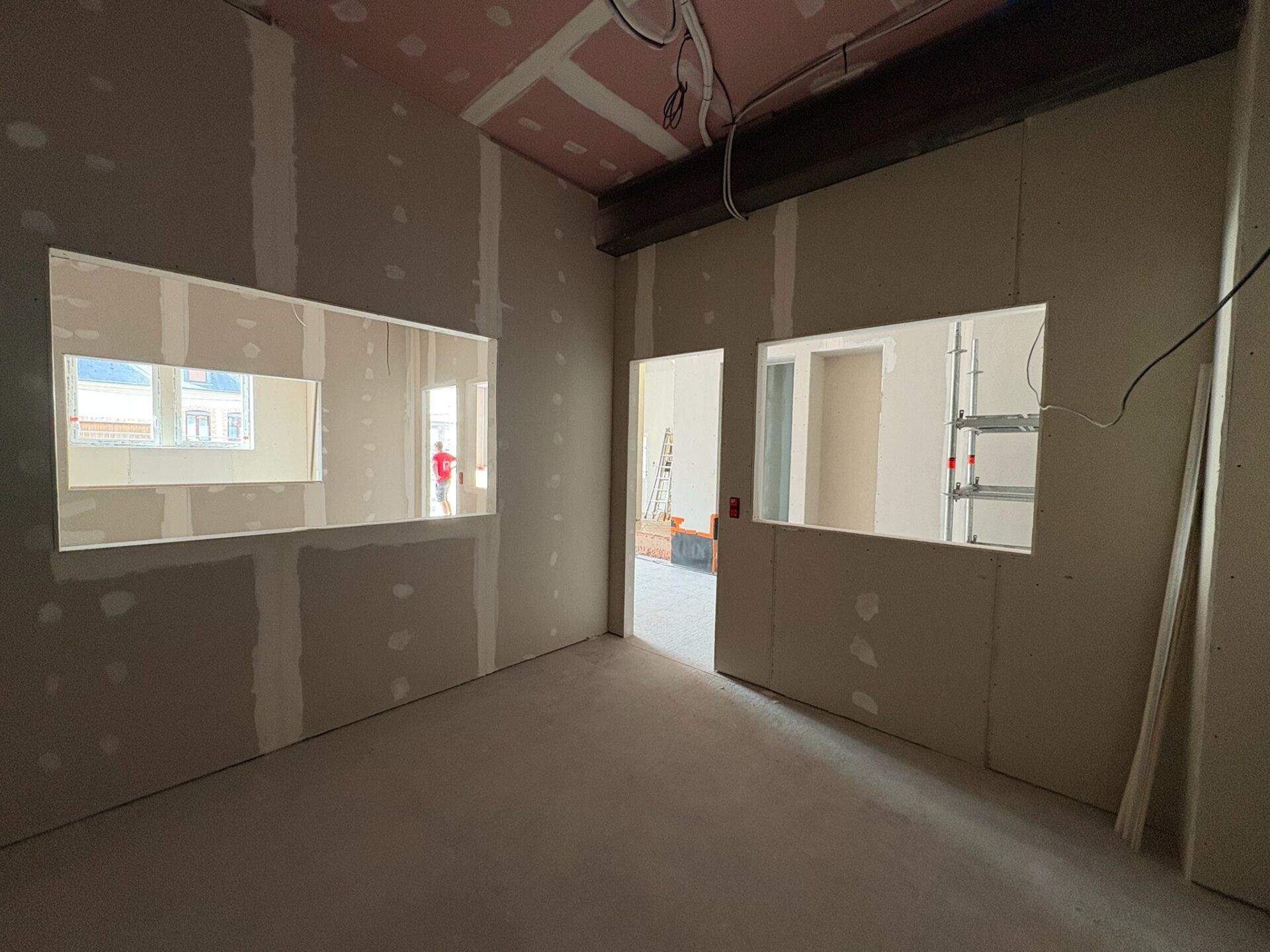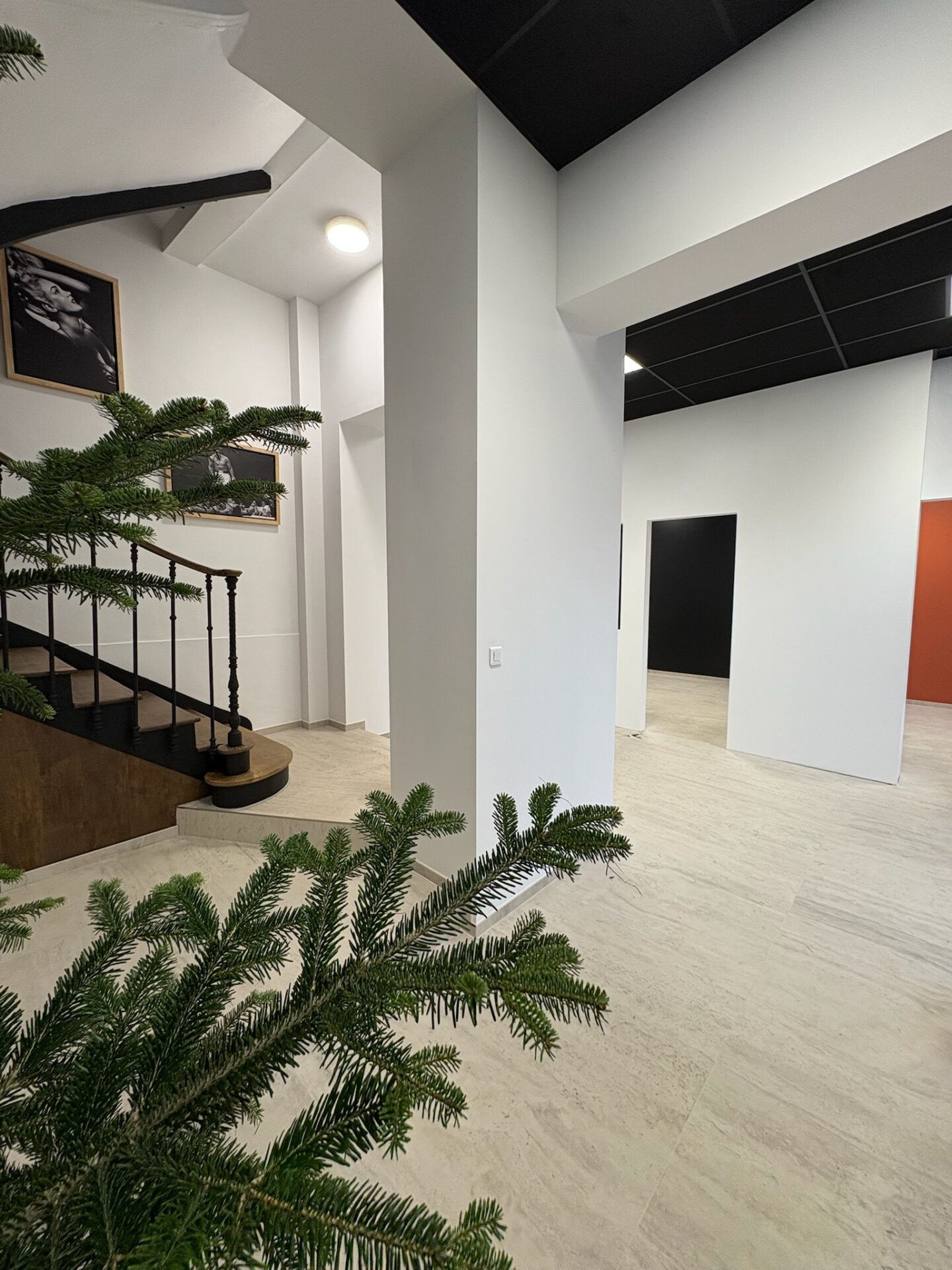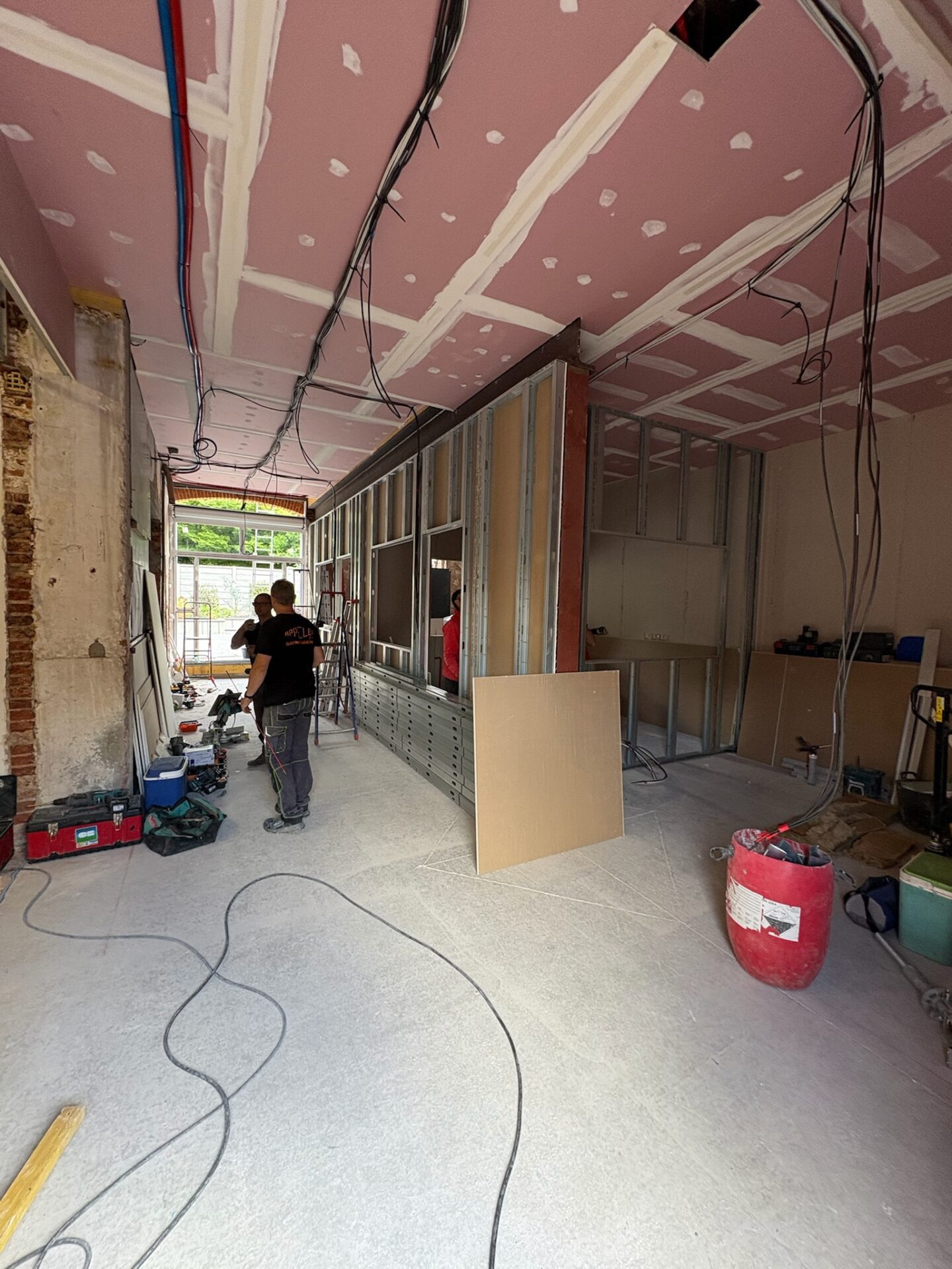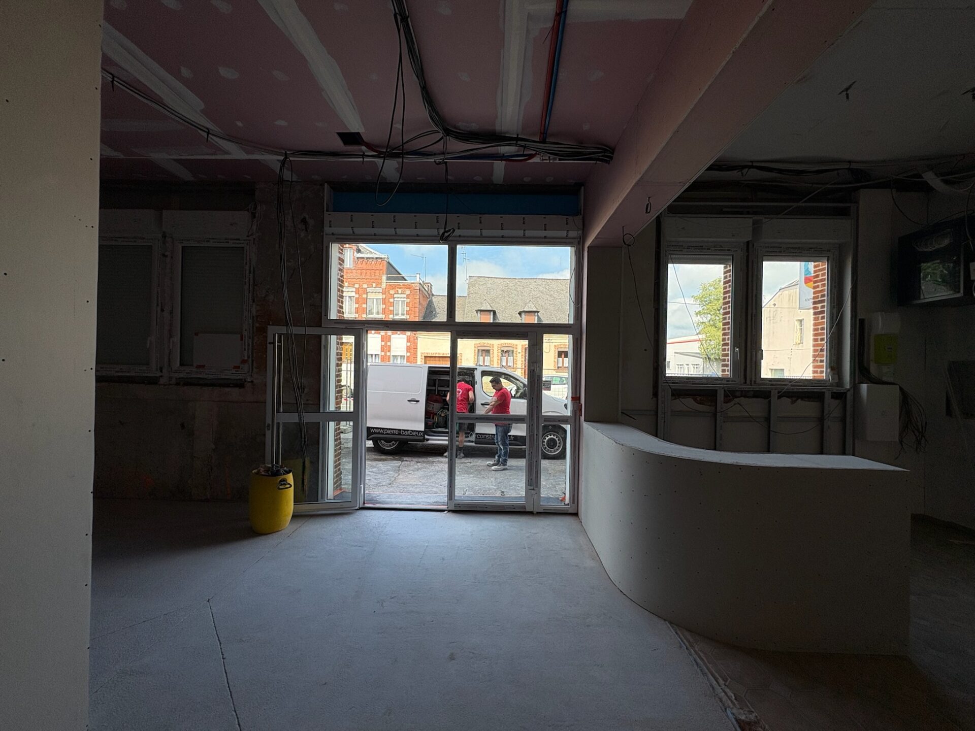 • Travaux de plâtrerie et d’enduit : Pose de cloisons en plaques de plâtre sur ossature métallique, doublages et faux plafonds dalles 120 X 60 coloris noir. Application d’enduits de finition sur l’ensemble des surfaces pour garantir une planéité et une préparation optimale avant mise en peinture.