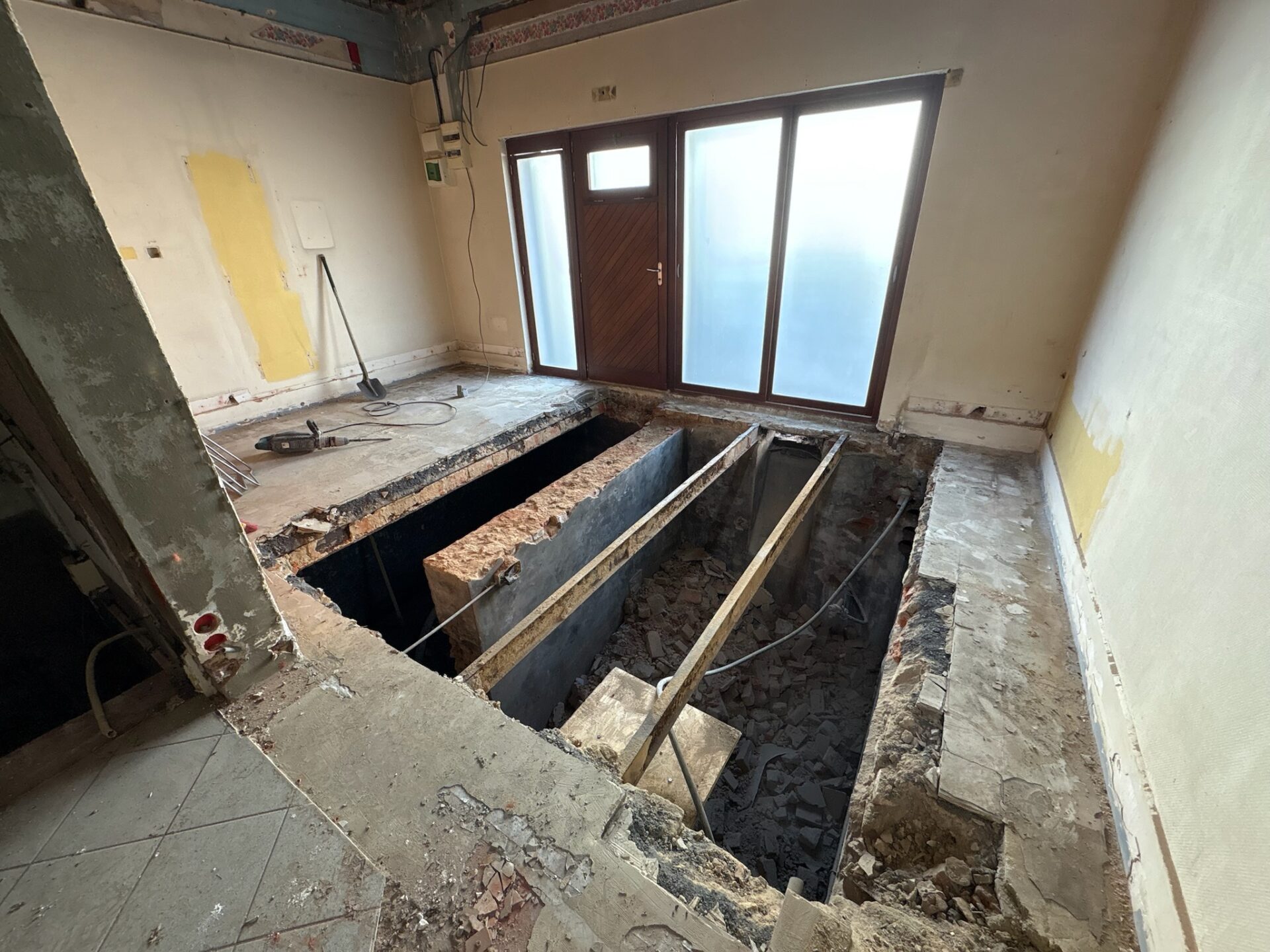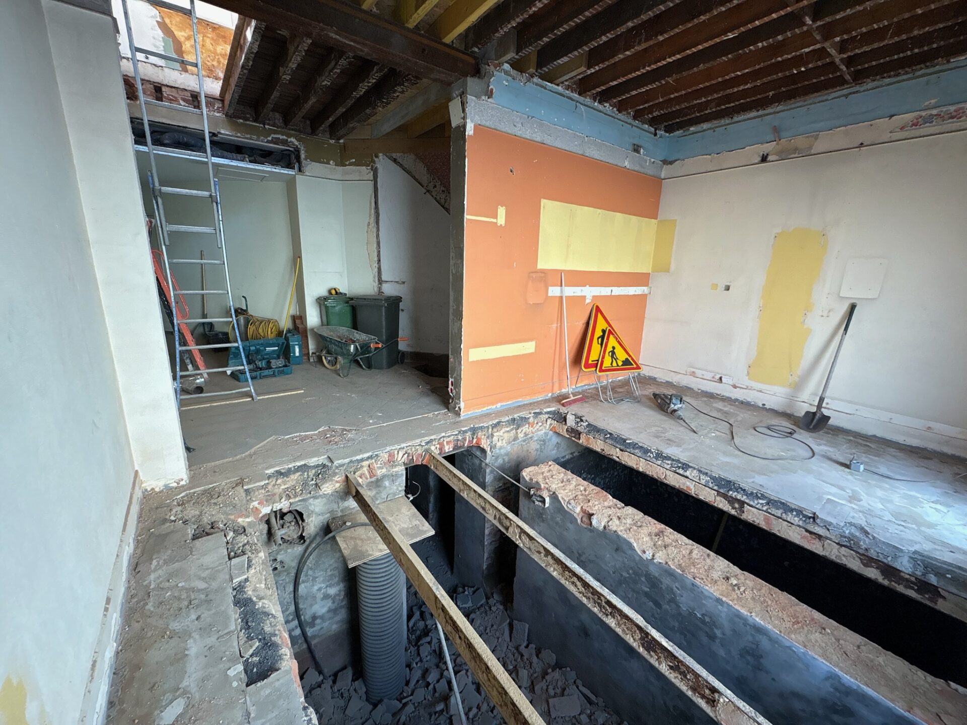 • Démolition intérieure : Dépose des anciens revêtements et démolition partielle des cloisons et sols existants afin de permettre la reprise du niveau général du plancher.