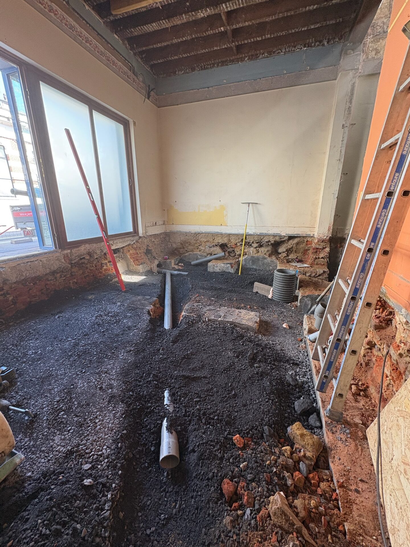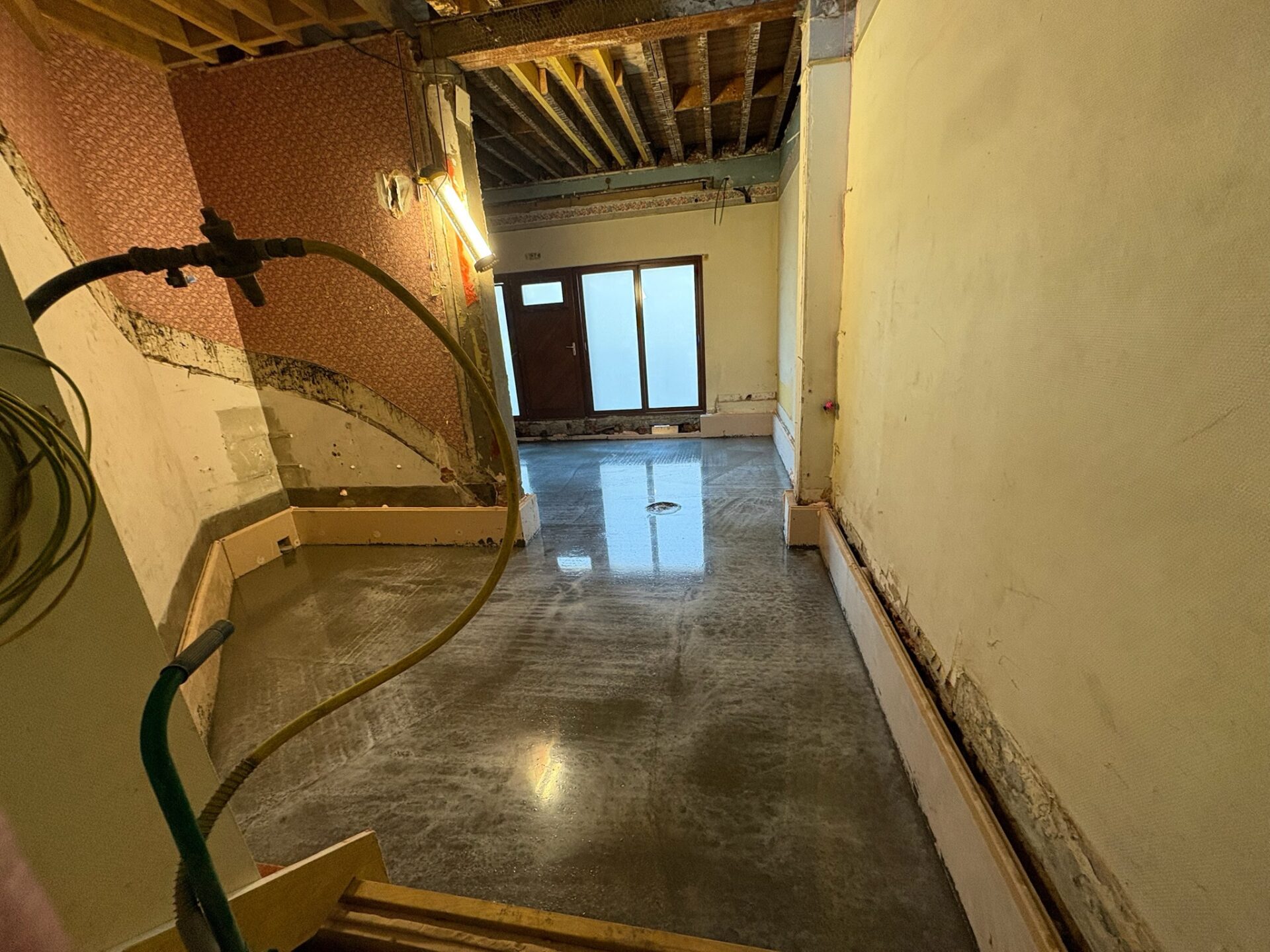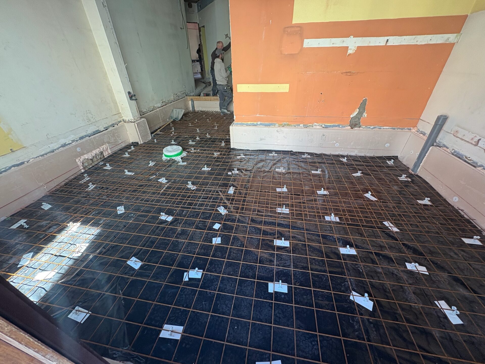 • Mise à niveau du plancher : Réalisation d’une dalle béton permettant la mise à niveau du rez-de-chaussée et l’accès PMR (personnes à mobilité réduite).