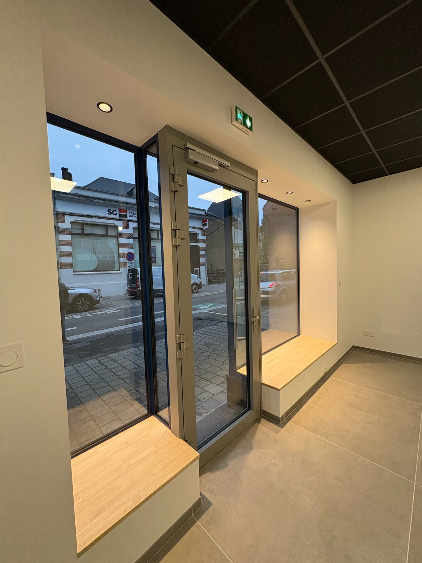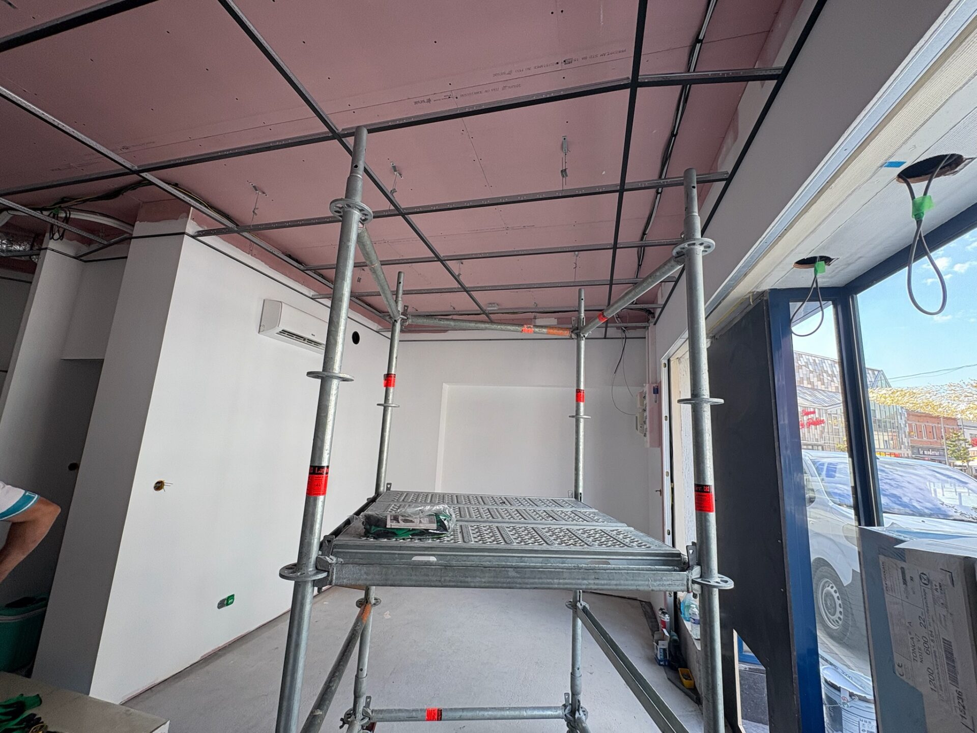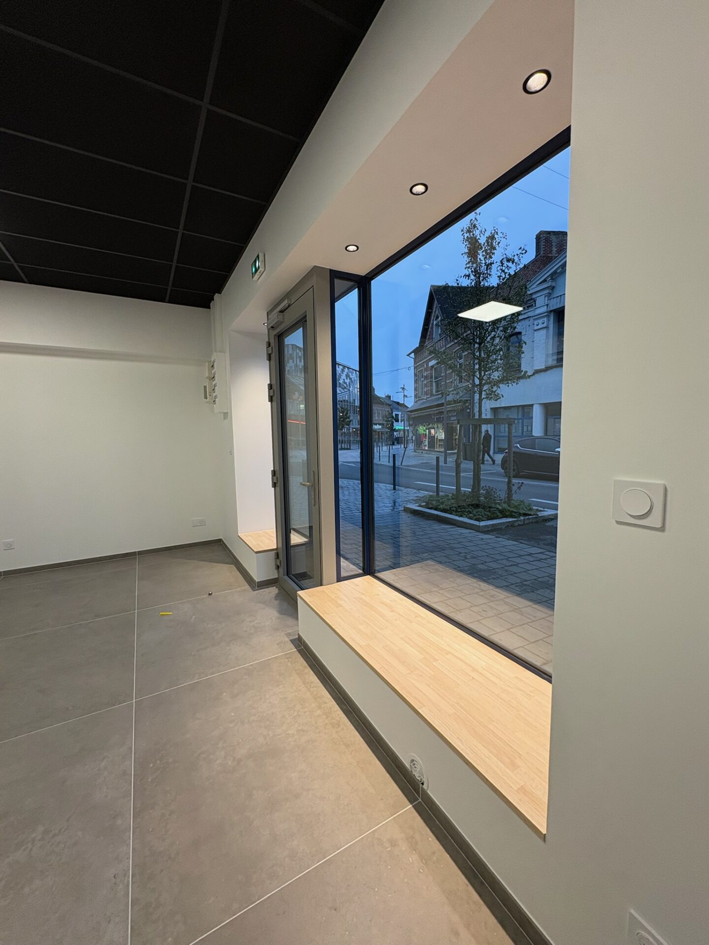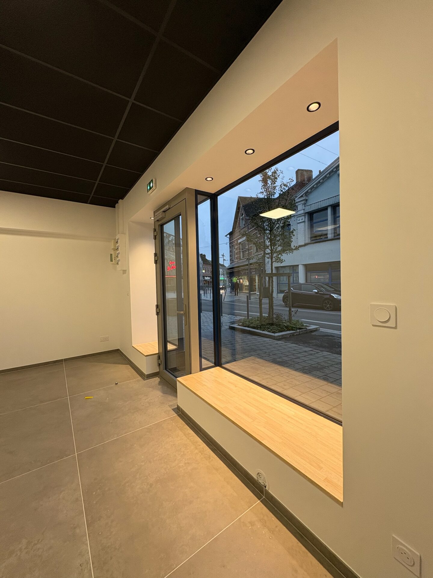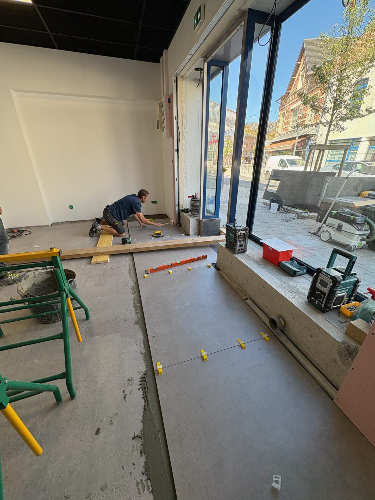 • Revêtement de sol : Pose d’un carrelage grand format 120 × 120 cm, assurant une finition moderne et résistante adaptée à un usage commercial.