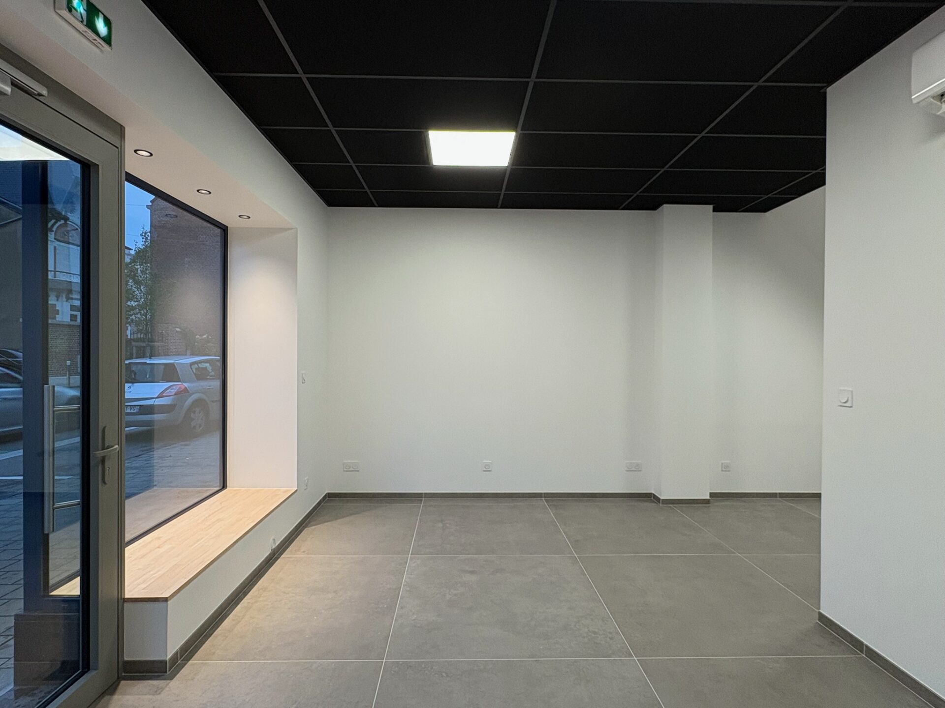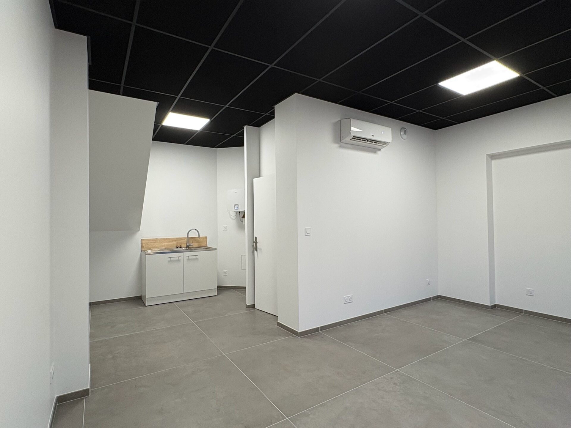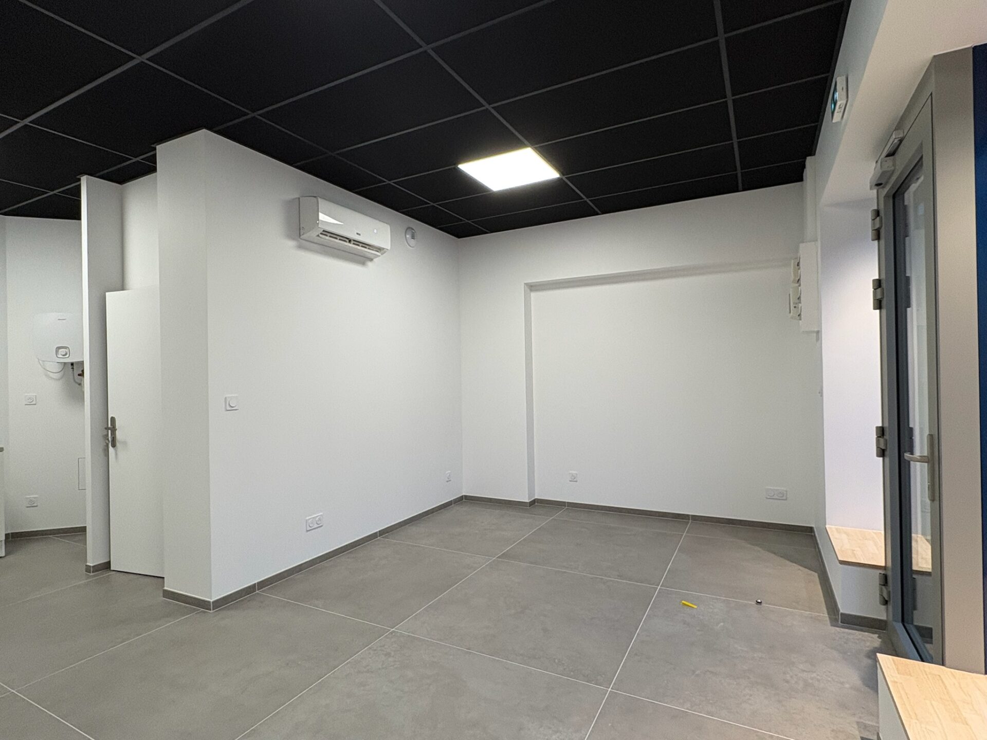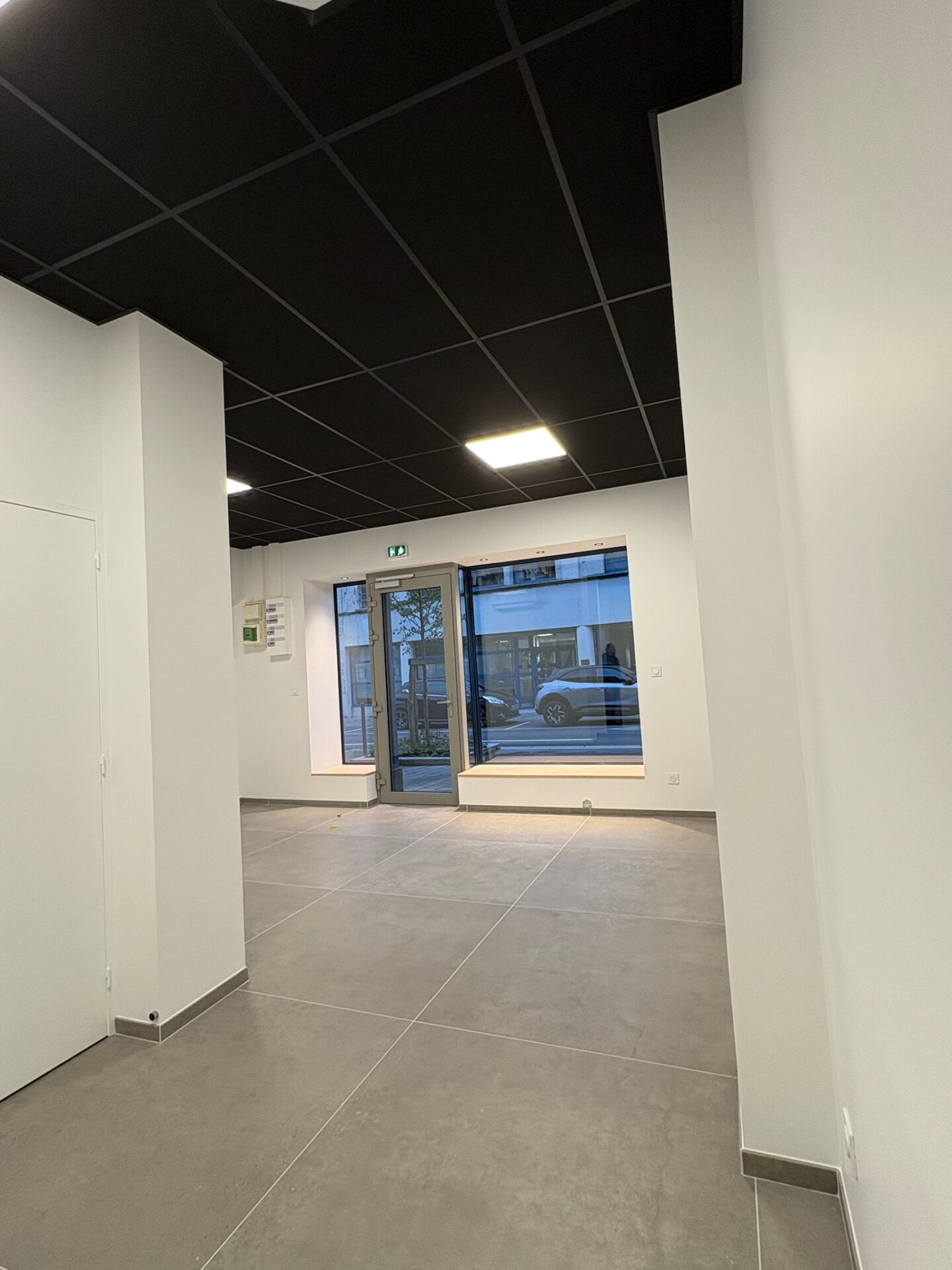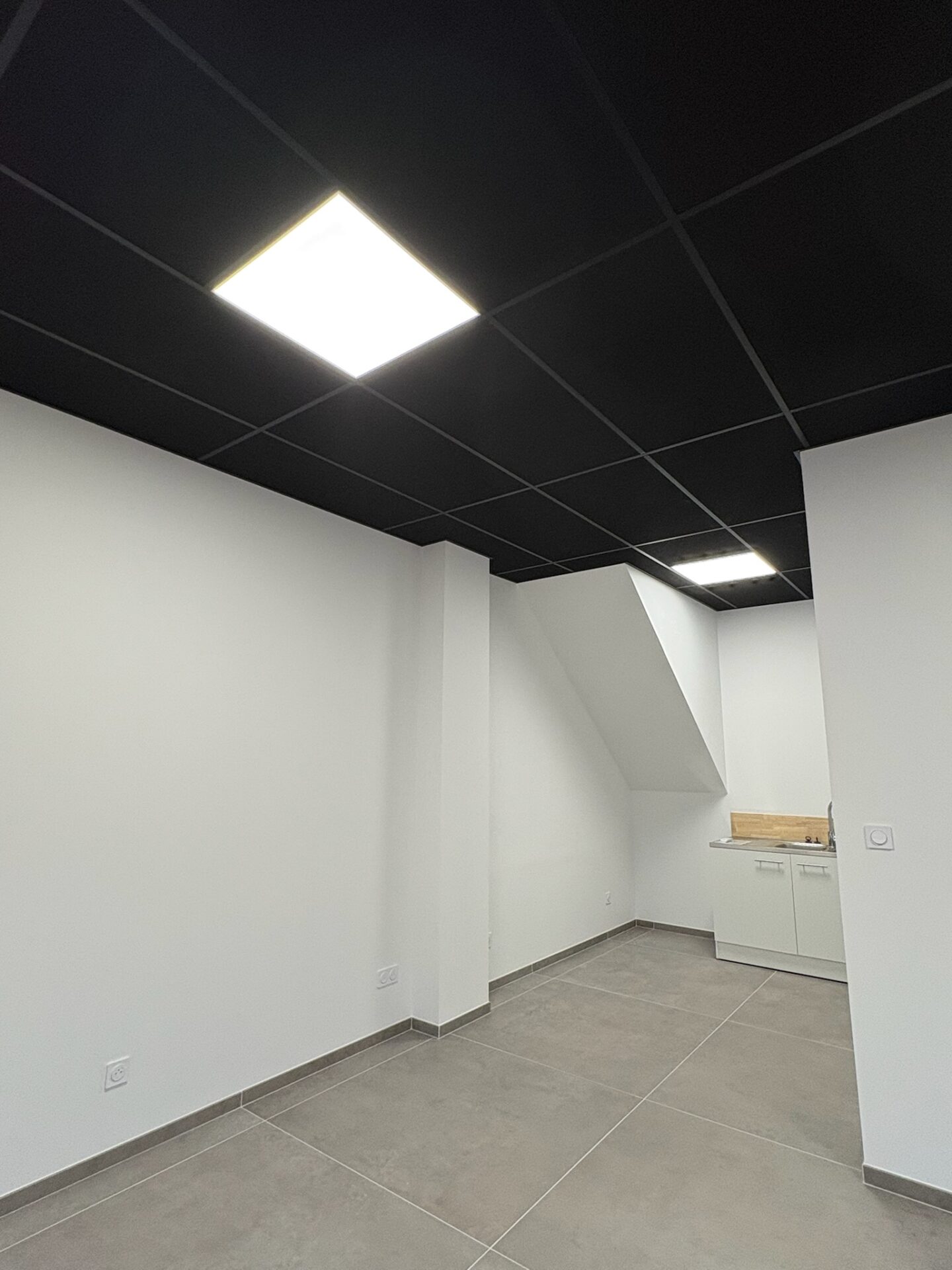• Faux plafond : Pose d’un plafond suspendu en dalles noires 600 × 1200 mm, participant à l’esthétique et à la correction acoustique du local.